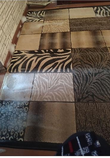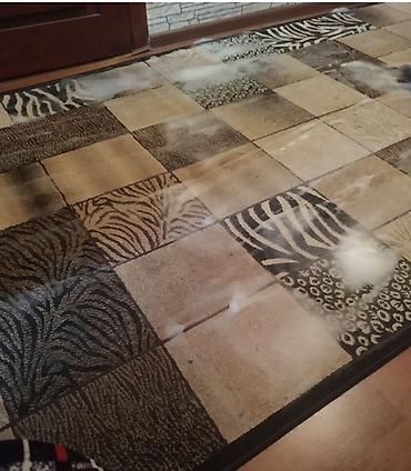 - Модель 1: прямоугольный ковёр в бежево-коричневой гамме, составлен из квадратов с «животными» принтами (зебра, леопард, пальмовый лист). Подойдёт для коридора или гостиной, нейтральные тона сочетаются с деревом и камнем.