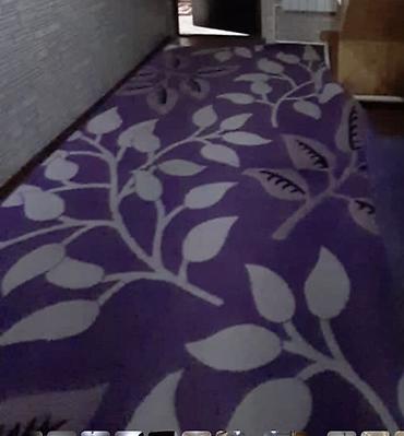 - Модель 2: фиолетовый ковёр с крупным бежевым растительным орнаментом по всей площади. Создаёт яркий акцент в длинном помещении или холле.