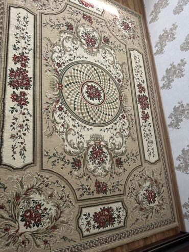 Элегантный ковер прямоугольной формы в бежевых тонах, украшенный классическим цветочным узором. В центре расположен круглый медальон с геометрическим орнаментом, окруженный пышными букетами красных роз и витиеватыми растительными элементами. Бордюр ковра выполнен в темных оттенках с мелким узором. Этот ковер подойдет для гостиной, спальни или прихожей, добавляя уюта и изысканности в интерьер.
