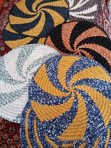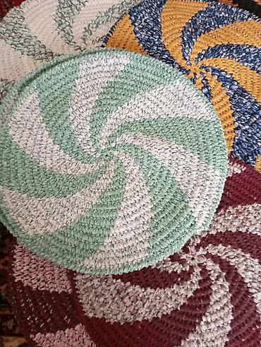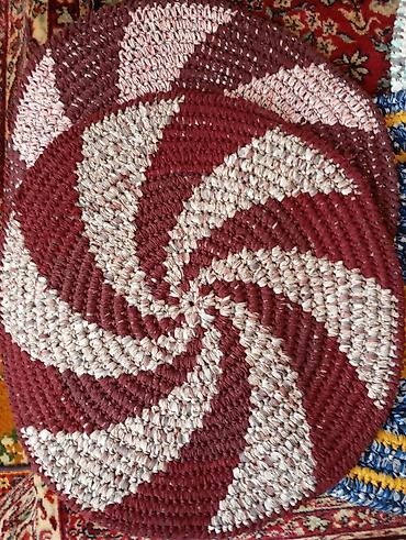 Вязанные изделия ручной работы из прочного шнура: - Круглый коврик с закручивающимся узором в зелено‑песочной гамме. Плотное, объемное плетение, аккуратная кромка. Подходит для прихожей, гостиной, ...