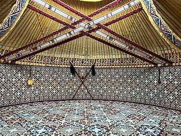 Подходит для юрт разных диаметров; можно комбинировать с настенными «ши́й»/басқұр и круглыми низкими столами.