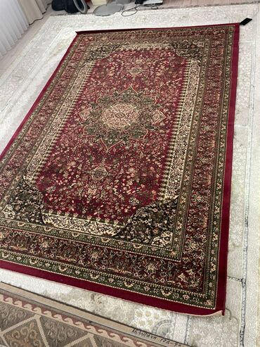 - Ковер 1: классический персидский стиль. Глубокий бордовый фон, центральная медальонная розетка, богатая растительная вязь по полю, многоступенчатая кайма в бордово‑зеленых тонах с бежевыми акцентами. Прямоугольная форма, плотный ворс, обметанные края.