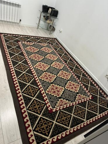 - Ковер 2: этно/караванный мотив с модульным узором. Геометрическая раскладка из ромбов и квадратов, контрастные элементы в черном, сером, охристом и бордовом цветах, декоративная кайма с волнистым орнаментом. Прямоугольная форма, мягкий ворс, надежная кромка.