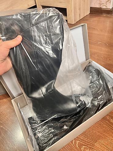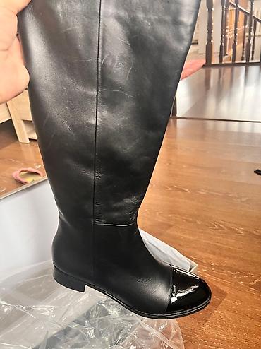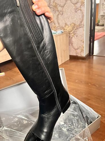 Высокие женские сапоги, классический черный цвет. - Материал верха: гладкая кожа (визуально — натуральная, мягкая, матовая). - Высота голенища: ниже колена. - Застежка: боковая молния. - Носок: ок...