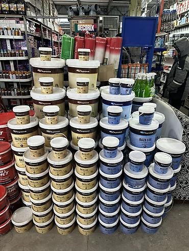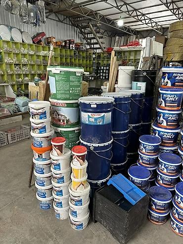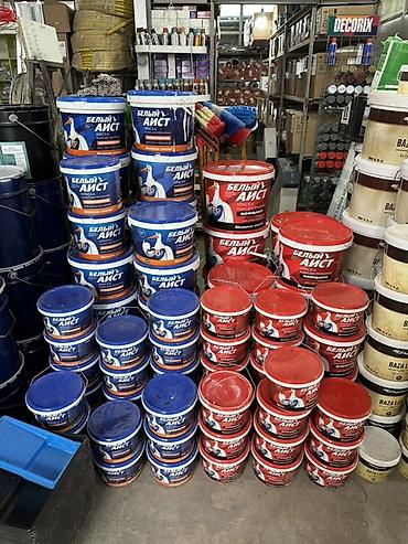 - Грунтовки, шпатлевки и базовые составы в ведрах различного объема (1–25 л) — для подготовки оснований под покраску и декоративные покрытия.
