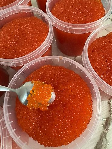 Икра красная зернистая в пластиковых ведёрках.