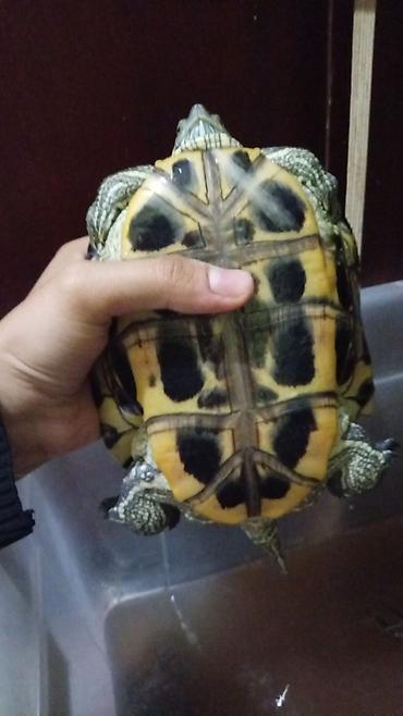 - Вид: полуводная черепаха с характерными светло-жёлтыми полосами на голове и контрастным пятнистым пластроном.