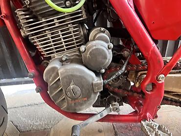 Мотоцикл дорожный/эндуро красного цвета с одноцилиндровым четырехтактным двигателем воздушного охлаждения.
