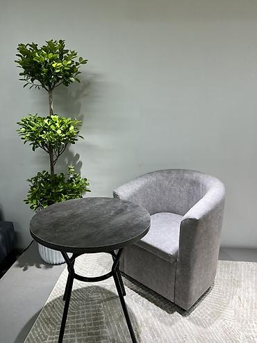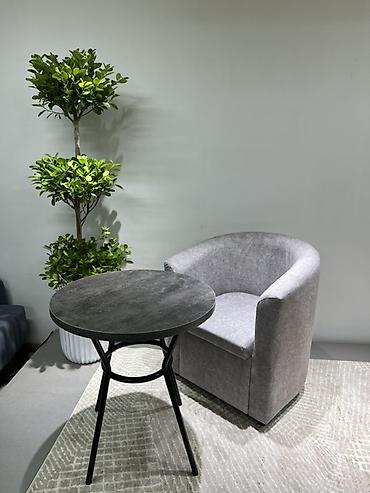 Дополнительно можно сочетать с круглым журнальным столиком темно‑серого каменного оттенка на черной металлической базе (виден на фото) для организации уютной зоны отдыха.