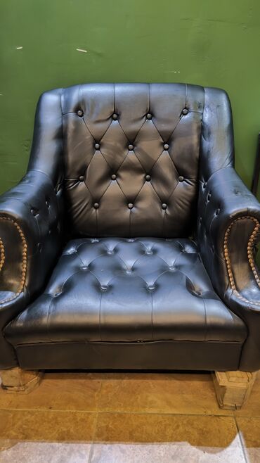 - Отделка: гладкая черная экокожа/кожа с глубоким капитоне (каретная стяжка) на спинке и сиденье.