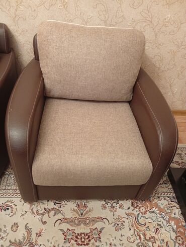 - Кресло: широкое сиденье и большая подушка-спинка. Обивка комбинированная: сиденье и подушка — плотная фактурная ткань бежевого цвета; боковины и основание — мягкая эко-кожа шоколадного оттенка. Плавные подлокотники, контрастная окантовка подушки.