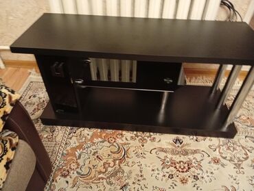 - ТВ-тумба: современный дизайн в черном цвете. Верхняя и нижняя столешницы из ЛДСП, декоративные металлические опоры. Центральная полка под технику, закрытая секция с глянцевой дверцей и небольшая ниша. Удобна для телевизора, приставки и аксессуаров.
