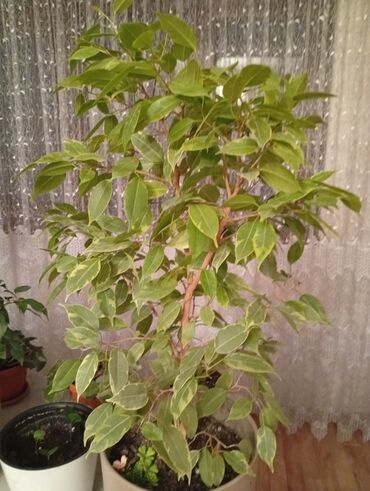 - Комнатное растение: фикус Бенджамина пестролистный в напольном горшке. Кустистая крона, листья с светлой каймой. Подходит для дома и офиса, неприхотлив в уходе.
