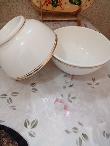 - Салатники: 2 белых фарфоровых миски с тонким золотистым кантом по краю. Универсальная форма — для салатов, гарниров и сервировки стола. Размеры ориентировочно средние.