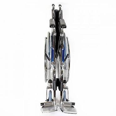 Кресло-коляска складная для инвалидов с ручным приводом, фиксированными подлокотниками и подножками. Рама выполнена из хромированной стали. Разработана с учетом потребностей инвалида, страдающего частичной потерей опорно-двигательного аппарата для передвижения в помещении и на улице по покрытию. Коляска предусматривает вес пользователя до 110 кг.