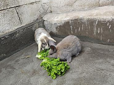 - Породы/типы на фото: вислоухий (лопоухий) кролик с пестрым окрасом и короткоухий пушистый кролик серо-голубого окраса.