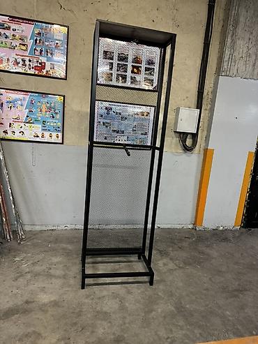 2) Высокую напольную стойку с перфорированной (сетки-рабицы/металлической просечки) задней и боковыми панелями для навесного оборудования: крючков, штанг, полок, держателей. В верхней части площадка под декоративную панель, лайтбокс или фирменную табличку.