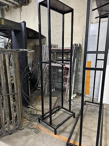 Торговые металлические стойки и островные конструкции под одежду/аксессуары в индустриальном стиле.