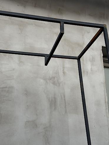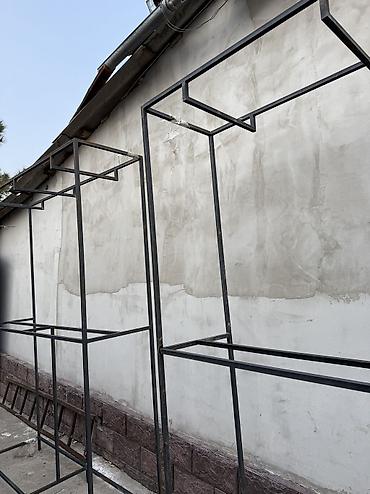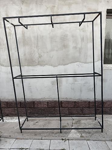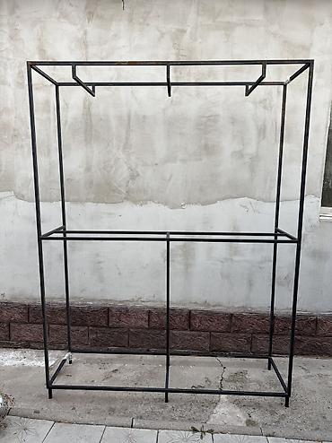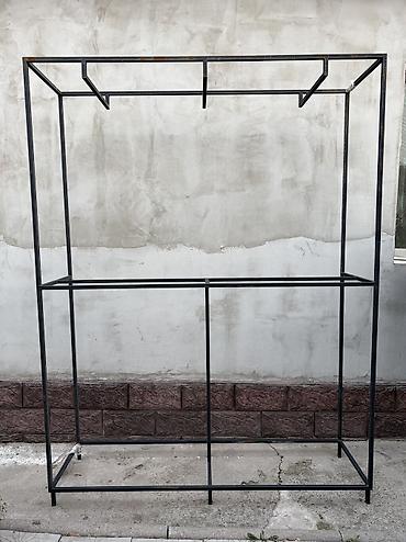 - Конфигурация: напольная рама с двумя горизонтальными уровнями; верхние выносы/кронштейны по периметру для навески плечиков или установки полок