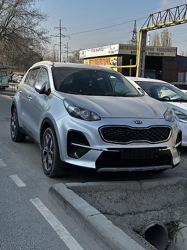 Kia Sportage — компактный кроссовер в серебристом цвете с современным внешним дизайном и фирменной решеткой радиатора.