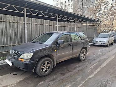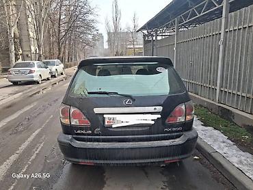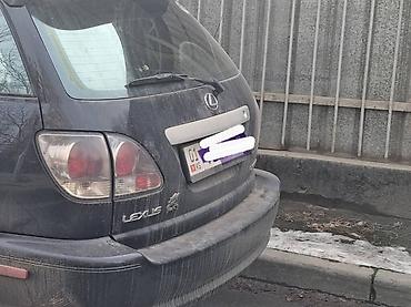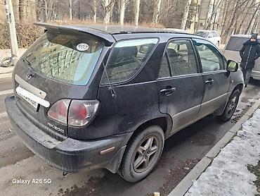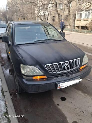 Lexus RX 300, кроссовер первого поколения (XU10). Кузов — 5‑дверный, цвет темный. Полный привод AWD. Литые диски, тонировка задних стекол, рейлинги на крыше, задний спойлер. Фары с линзами, передние противотуманные огни, повторители на крыльях. Заводская решетка радиатора с эмблемой Lexus, шильдики RX300. Задняя дверь с стеклоочистителем и высоким стоп-сигналом. Салон на 5 мест, высокий клиренс, удобный доступ в багажник.