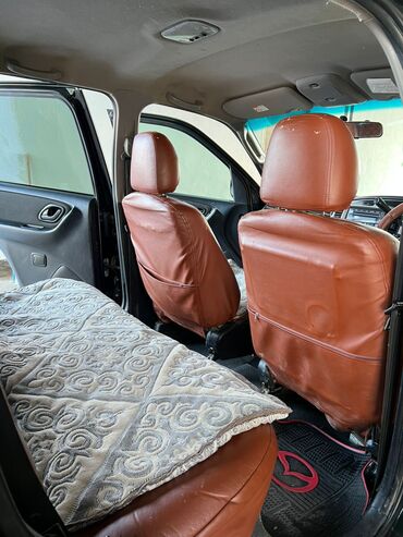 - Тканевые накидки на сиденья, чехлы из коричневой экокожи, резиновые коврики с логотипом Mazda.
