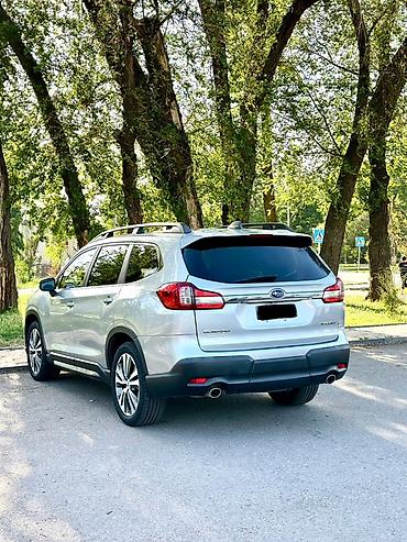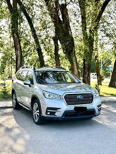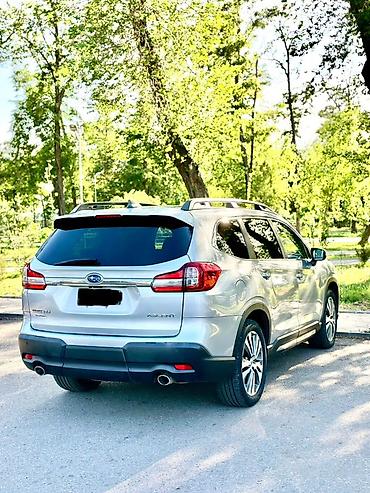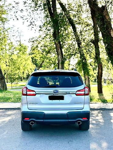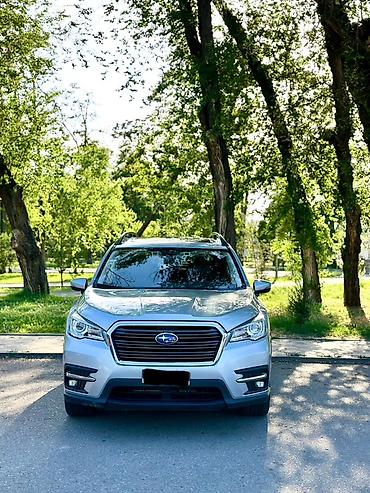 Subaru Ascent, серебристый кроссовер 7–8 мест (эмблемы на кузове). Полный привод Symmetrical AWD, клиренс для городских и загородных дорог. Двигатель Boxer с турбонаддувом, двухвыпускная система (две выхлопные трубы).