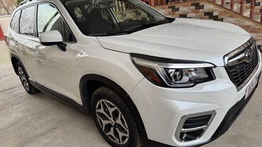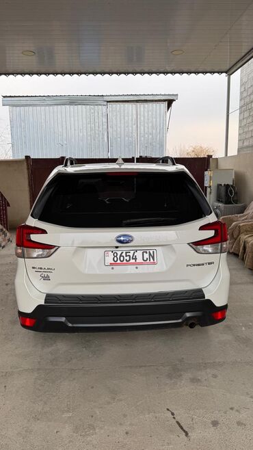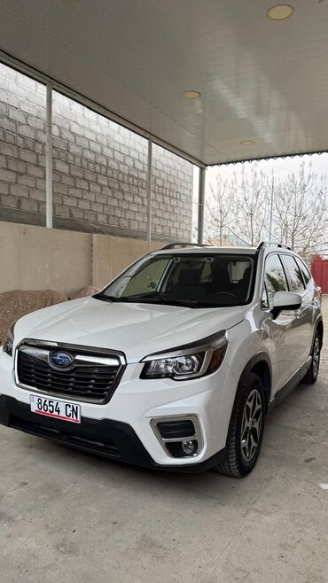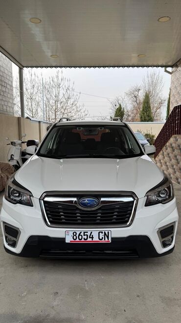 Subaru Forester, белый кроссовер (пятое поколение). Полный привод Symmetrical AWD, клиренс для бездорожья, рейлинги на крыше. Современная оптика: светодиодные фары и ДХО, противотуманные фары, повторители в зеркалах. Камеры и датчики системы помощи водителю EyeSight видны в верхней части лобового стекла.