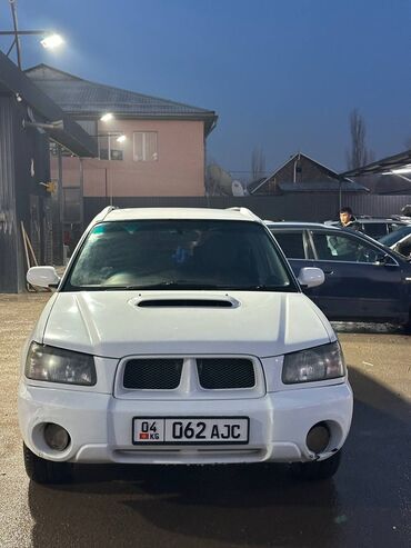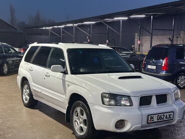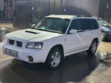 Белый кроссовер Subaru Forester (поколение SF/SG). Внешность с фирменным воздухозаборником на капоте, пластиковым обвесом и рейлингами на крыше. Пятидверный кузов, просторный салон и багажник, высокая посадка. Задняя дверь с вертикальным стеклом, тонировка задних окон.