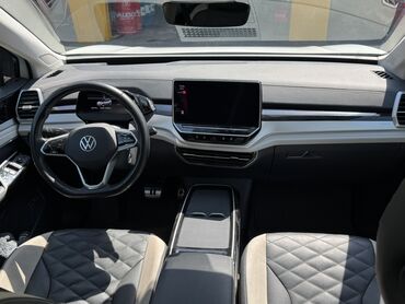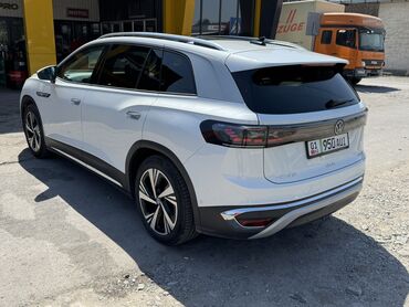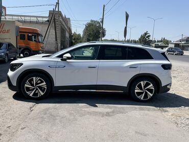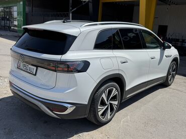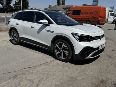 Электрический кроссовер Volkswagen ID.6 белого цвета с панорамной крышей и черными глянцевыми акцентами, включая крышу и нижнюю часть бамперов. Модель оснащена стильными двухцветными дисками и светодиодной оптикой, что подчеркивает ее современный дизайн. Идеально подходит для городских поездок и семейных путешествий, предлагая комфорт и экологичность.