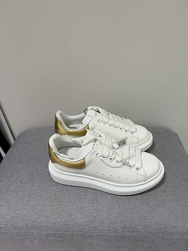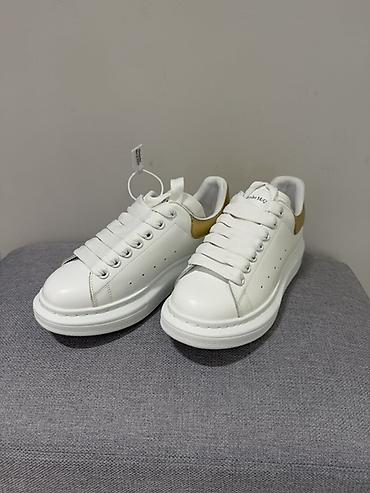 - Детали: широкие шнурки, металлические люверсы, фирменный логотип Alexander McQueen на язычке и на золотистой вставке пятки