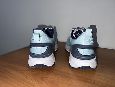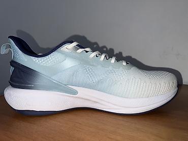 - Верх: дышащий текстиль/сетка с различной плотностью вязки для вентиляции и поддержки. Цвет: светло‑голубой с темно‑синими акцентами и белой шнуровкой.