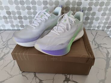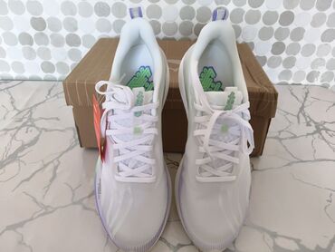 Легкие беговые кроссовки в фирменной коробке. Особенности: - Цвет: белый с переливами неона (зеленый/лиловый), полупрозрачный верх. - Верх выполнен из тонкого дышащего сетчатого материала с поддер...