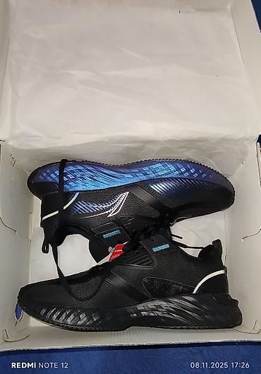 Кроссовки для бега/фитнеса, черные с бирюзовыми акцентами и градиентной синей подошвой.