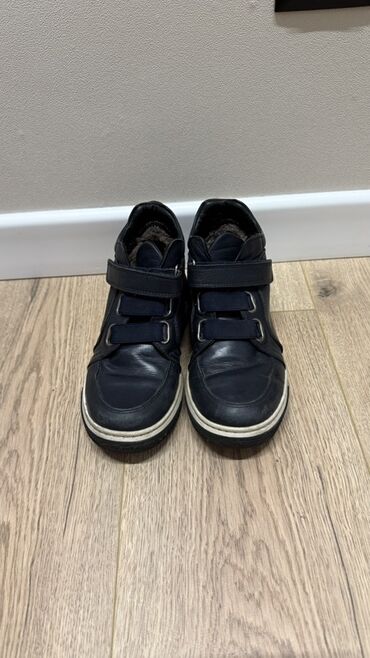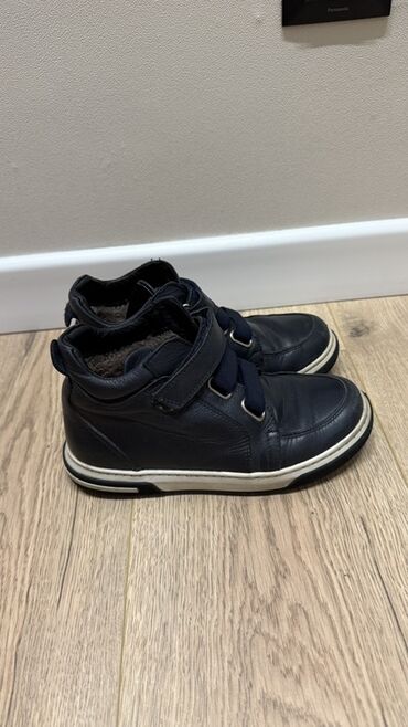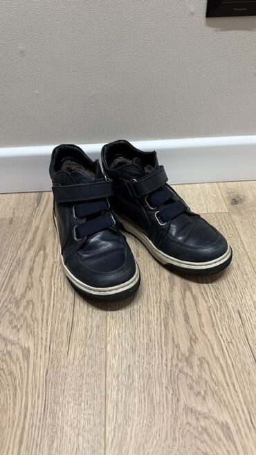 32Темно-синие высокие кожаные кроссовки с застежками-липучками. Удобная обувь с мягкой подкладкой внутри и белой подошвой, подходящая для повседневной носки.