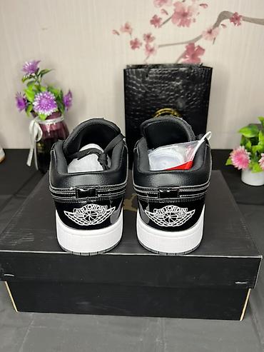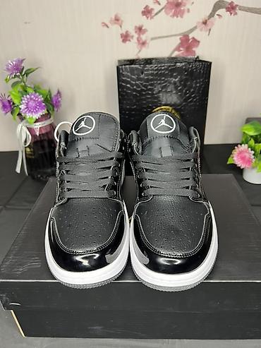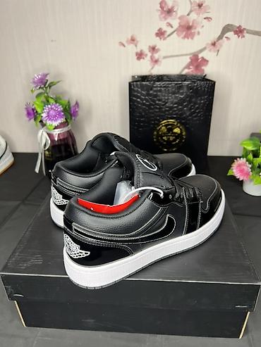 - Классическая низкая модель AJ1 с логотипами Jumpman на язычках и крыльями Air Jordan на пятке.