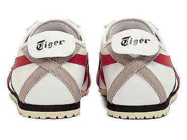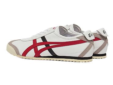 - Верх из гладкой белой кожи с фирменными полосами Onitsuka Tiger в красном и черном цветах.