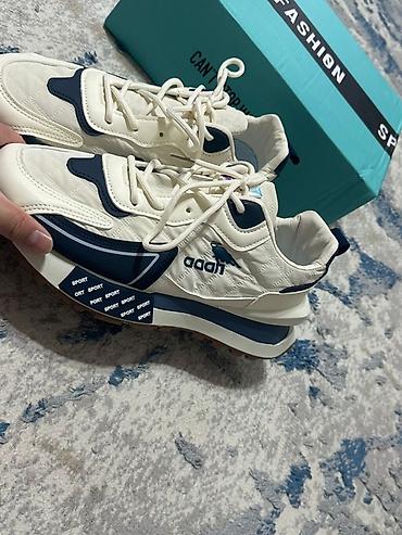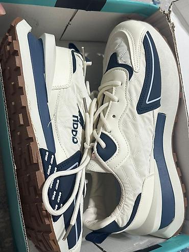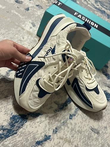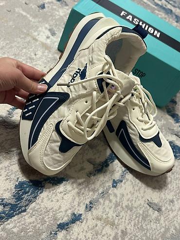 - Цвет: молочный с темно‑синими вставками и светло‑коричневой подошвой.