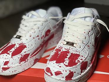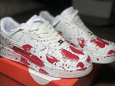 - Дизайн: индивидуальный художественный кастом — контрастные красные «сплэш»-брызги по всему верху и мидсолу. Эффектный, привлекающий внимание стрит‑стайл.