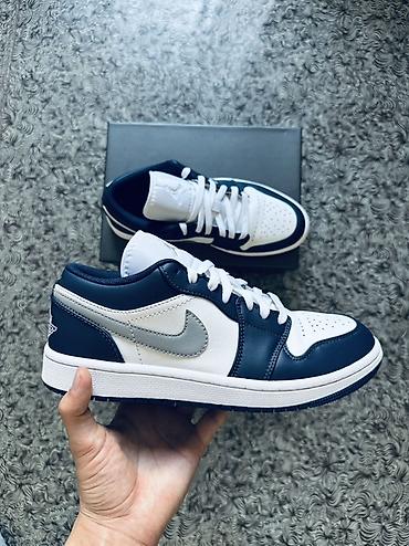 Кроссовки Nike Air Jordan 1 Low 43 размер - Модель: Air Jordan 1 Low - Цвет: темно‑синий/белый с серым Swoosh - Материалы верха: гладкая кожа с перфорацией на мысе для вентиляции - Подкладка: мягк...