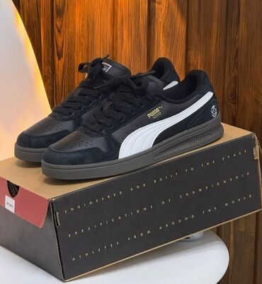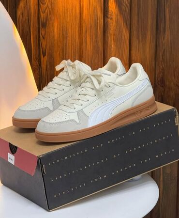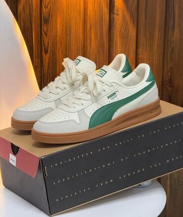 Классические кроссовки Puma "Palermo" с низким профилем, выполненные из комбинации кожи и замши. Модель имеет перфорированный носок для улучшенной вентиляции, а также характерную для бренда боковую полосу. Подошва из резины обеспечивает хорошее сцепление. Идеально подходят для повседневного использования и создания стильного образа. Представлены в нескольких цветовых вариантах: кремовый с темно-синими элементами, кремовый с зелеными полосами и коричневой подошвой, полностью черный с белой полосой и кремовый с белыми полосами и коричневой подошвой. Надежный выбор для комфортной ходьбы.