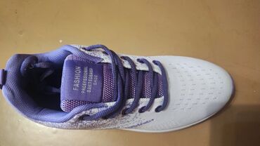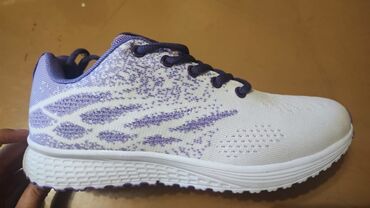 Эти кроссовки предназначены для бега и активного отдыха, обеспечивая комфорт и поддержку. Верх из дышащего материала обеспечивает хорошую вентиляцию, сохраняя ноги сухими. Фиолетовые шнурки и узор на боковых панелях добавляют стильный акцент. Подошва с рельефным протектором обеспечивает надежное сцепление с поверхностью, что делает их подходящими для различных видов активности на улице или в спортзале. Они подойдут для повседневного использования, прогулок, занятий спортом и легких тренировок.