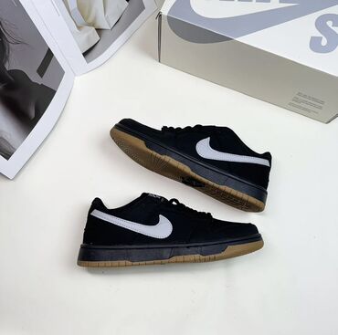 - Цвет: черный верх, белый Swoosh, коричневая (gum) подошва.