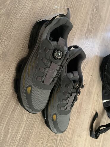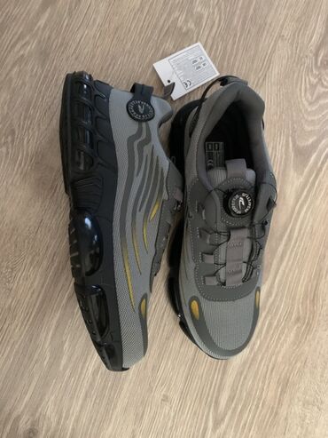 Кроссовки серо‑чёрные с жёлтыми акцентами и мощной амортизирующей подошвой. Технология с Железным носком. Отлично подойдут для строительной работы