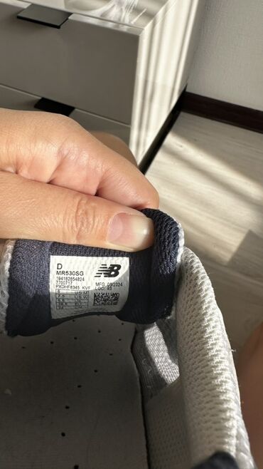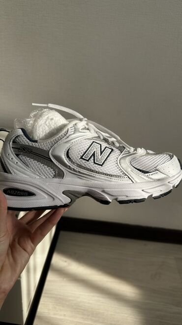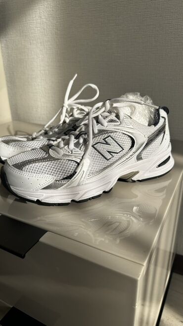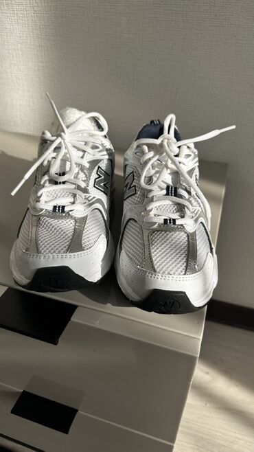 Кроссовки New Balance 530 (модель обозначена на борту) в классической бело‑серебристой расцветке. Заказала из официального сайта США, оказались малы.