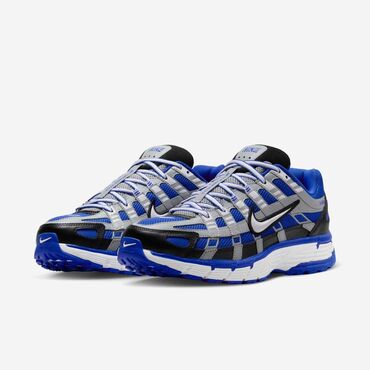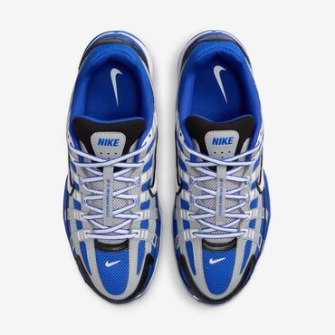 - Детали дизайна: серебристый Swoosh, контрастные серые и чёрные накладки, акценты ярко‑синего цвета; брендирование Nike на язычке, боковой части (P-6000) и мысе