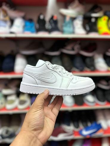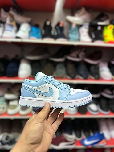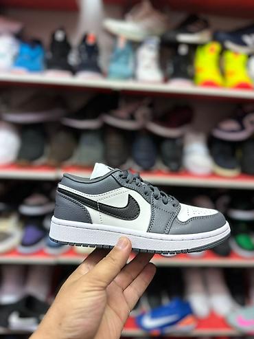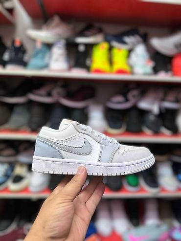 Кроссовки в тёмно-синем, белом и сером цветах с низким профилем. Модель оснащена классической шнуровкой для надёжной фиксации стопы. Подошва белого цвета обеспечивает хорошее сцепление с поверхностью, что делает эти кроссовки удобными для повседневной носки и активного отдыха. Логотип Nike в виде «свуша» и крылья Air Jordan на задней части обуви подчёркивают спортивный стиль.