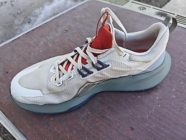 - Цвет: бежевый/молочный верх, оранжево-красный язычок, тёмный логотип, серо-оливковая подошва.