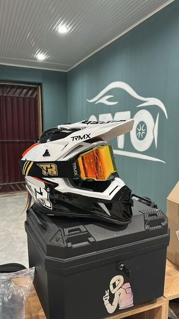 - Комплектация: шлем + мотокроссовые очки с зеркально‑оранжевыми линзами и эластичным ремнём TRMX