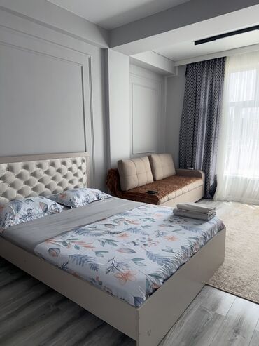 Уютная квартира-студия с балконом. В комнате есть диван, который легко трансформируется в спальное место, а также удобная двуспальная кровать. В ванной комнате установлена стиральная машина. Кварти...